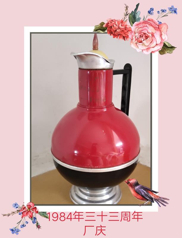 記憶一:暖水瓶——1984年金猴創(chuàng)立33周年時企業(yè)給職工發(fā)的紀念品。這是一件造型別致的暖水瓶,由壺蓋、壺身、壺座、壺把組成,壺蓋類似于蒙古帽,壺身形狀類同瓷器中的天球瓶。整個壺體由紅黑銀三種顏色互相襯托,顯得端莊大氣又不乏時尚感。以八十年代初期的生產技術水平,這種工藝造型的暖水瓶已經很超前了。由于該紀念壺距今已近四十年,當時工廠規(guī)模小,職工只有幾百人,只發(fā)給“正式工人”和“亦工亦農”,所以數(shù)量不多,且又是生活必需品,報廢率高,存世量少,具有一定的收藏價值。
