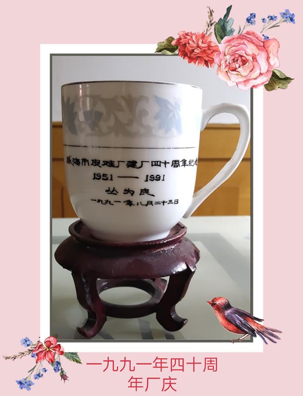 記憶二:陶瓷水杯——1991年金猴創(chuàng)立40周年時企業(yè)為職工定制的專屬陶瓷水杯。1989年威海市二輕工業(yè)局改組了威海市皮鞋廠領導班子,年輕的帶頭人柳富林廠長新官上任點燃了三把火:一是抓拳頭產品,重獎設計人員;二是拓展銷售市場,打開產品渠道;三是擴大企業(yè)規(guī)模,提升生產能力。到1991年四十周年廠慶的時候,企業(yè)已經擺脫了困境,技術、銷售、生產三條戰(zhàn)線處處充滿生機和活力,企業(yè)取得了長足的發(fā)展。這一年,企業(yè)合并了“威海市皮鞋材料廠”,“威海市皮鞋廠”改名為“威海市皮鞋工業(yè)集團公司”。為了鼓勵廣大干部職工這種火熱的工作激情,工廠派專人到中國四大瓷都之一的淄博,為每位干部職工定制了這款專屬陶瓷水杯。這個陶瓷水杯“白如玉,明如鏡,薄如紙,聲如磐”,是一件非常精美且具有紀念意義的陶瓷制品。