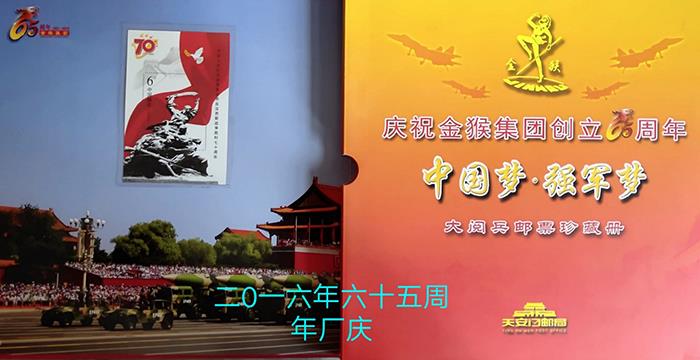 記憶五:大閱兵郵票珍藏冊——2016年金猴創(chuàng)立六十五周年華誕時企業(yè)給職工發(fā)的精美大閱兵郵票珍藏冊。在過去的五年時間里,企業(yè)面對殘酷的市場競爭,披荊斬棘,乘風破浪,內銷出口兩翼齊飛,軍民融合發(fā)展得到了進一步的拓展。企業(yè)連年躋身“中國皮革行業(yè)10強業(yè)”、“中國輕工業(yè)100強企業(yè)”、“中國民營企業(yè)500強”、“中國制造業(yè)企業(yè)500強”行列。公司技術中心被認定為“國家級工業(yè)設計中心”,為企業(yè)插上了騰飛的翅膀。公司堅持深化軍民融合戰(zhàn)略,2015年在中國人民抗日戰(zhàn)爭暨世界反法西斯戰(zhàn)爭勝利70周年大閱兵上,金猴產品再次為“9.3大閱兵”增添風采,公司還被閱兵聯(lián)合指揮部授予“閱兵保障突出貢獻獎”。2016年公司被中共山東省委、山東省人民政府、山東省軍區(qū)授予“山東省愛國擁軍模范單位”,體現(xiàn)了黨委、政府和軍隊對公司為國防軍隊建設做出貢獻的充分肯定。為了永遠銘記金猴集團保障的兩次大閱兵激動人心的美好瞬間,助力國家實現(xiàn)中國夢強軍夢的偉大征程,金猴集團策劃制作了這本“中國夢?強軍夢”大閱兵郵票珍藏冊。這是一本珍貴精美的郵票冊,里面收藏了幾十枚珍貴稀有的郵票,發(fā)給全體在職和離退休干部職工,作為永遠的紀念。
