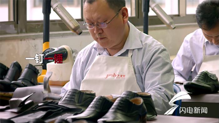 裁皮、片皮、壓襯、臥口、繃楦……生產(chǎn)車(chē)間內(nèi),數(shù)條生產(chǎn)線同時(shí)開(kāi)工,幾十名手藝純熟的鞋匠雙手翻飛如行云流水,一釘一錘、一針一線間129道工序一絲不茍地完成。