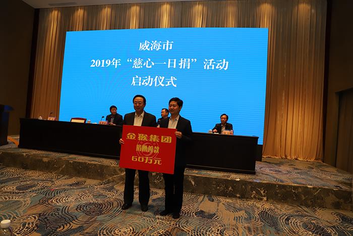 2019年11月1日,威海市2019年“慈心一日捐”活動(dòng)啟動(dòng)儀式在東山賓館舉行,集團(tuán)公司紀(jì)委書(shū)記、工會(huì)主席鄒曉伍代表金猴集團(tuán)向市慈善總會(huì)捐款60萬(wàn)元。