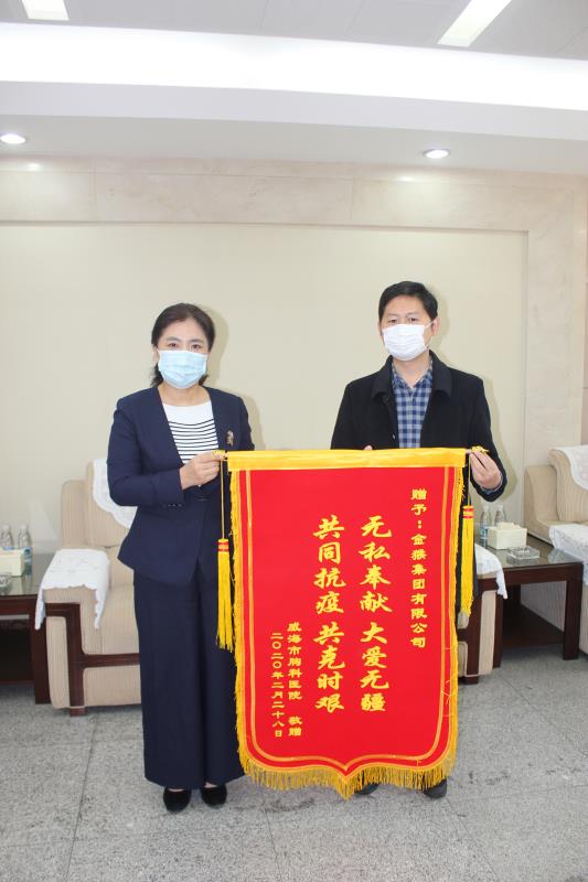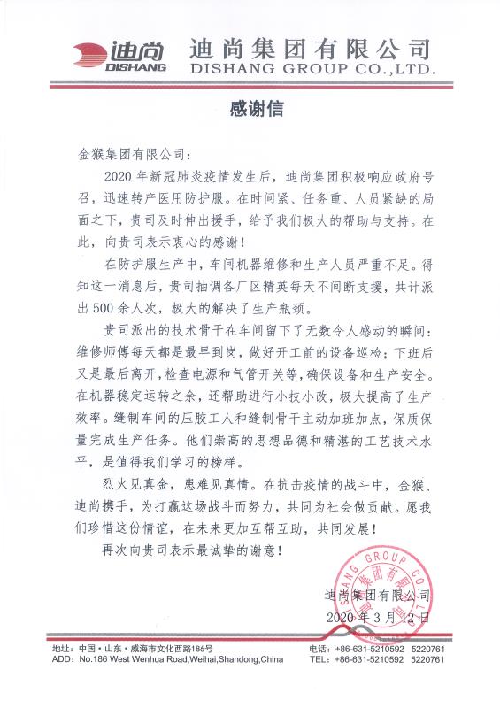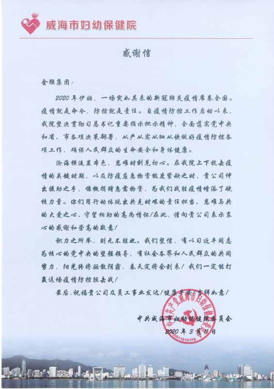 近兩月來(lái),威海市委市政府及5區(qū)2市主要領(lǐng)導(dǎo)先后給集團(tuán)董事長(zhǎng)打電話稱贊金猴集團(tuán)在抗擊新冠病毒戰(zhàn)役中的慈心善舉,婦幼保健院赴武漢醫(yī)療隊(duì)、威海胸科醫(yī)院、環(huán)翠樓街道商圈黨委、迪尚集團(tuán)等單位還給我公司送來(lái)感謝信和錦旗,對(duì)我公司積極出錢出人出物資全力支持部隊(duì)、地方政府、衛(wèi)生系統(tǒng)打贏疫情阻擊戰(zhàn)表示欽佩和感激。
