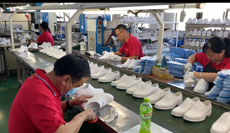 每一雙看似簡潔大方的鞋品里,都飽含金猴集團賦予其中的十足“科技感”:采用納米防靜電技術,有效杜絕灰塵污染,讓每一雙白皮鞋保持潔白如云的狀態(tài);采用橡筋布假系帶結構,在正常系帶款式部位巧妙使用穿皮條皮工藝;鞋墊底采用具備抑菌除臭吸汗的納米寶麗優(yōu)材質,同時在鞋底加入呼吸換氣裝置,讓參會人員時刻保持足部干爽清涼。