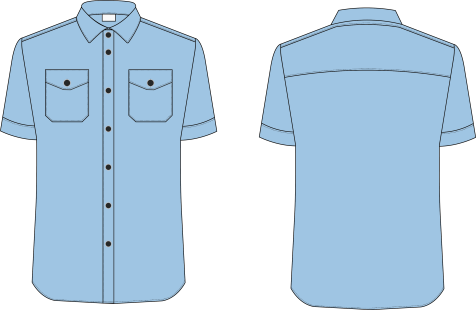 短袖施工服上衣不使用拉鏈,前門襟處由鈕扣固定。上衣胸前直插口袋兩個,領子為翻領結構,袖口、下擺做包邊處理。